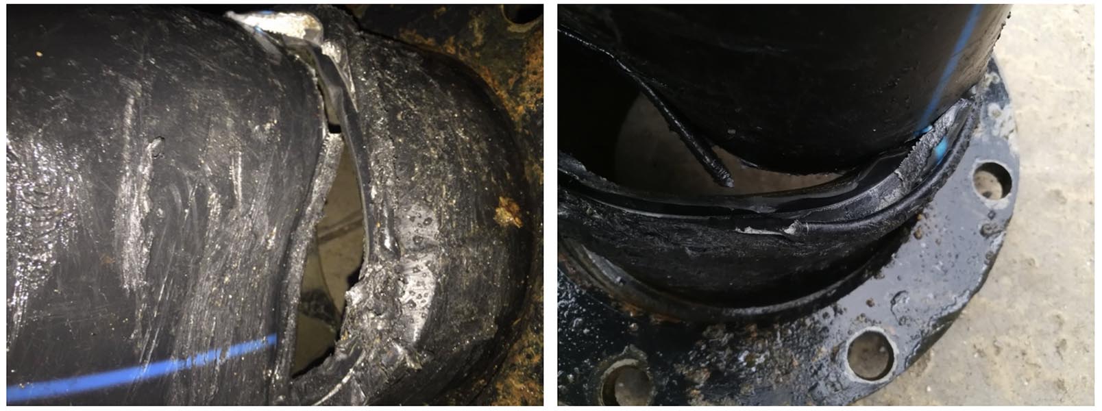 在探测过程中,经过反复确认后,在农田中发现一条DN400,埋深约1.5米的水泥管道存在疑似漏点。经现场开挖发现, 漏点为DN400主管与DN160 PE分支管接口处的法兰松动脱落导致漏水发生,初步分析原因为施工质量问题。